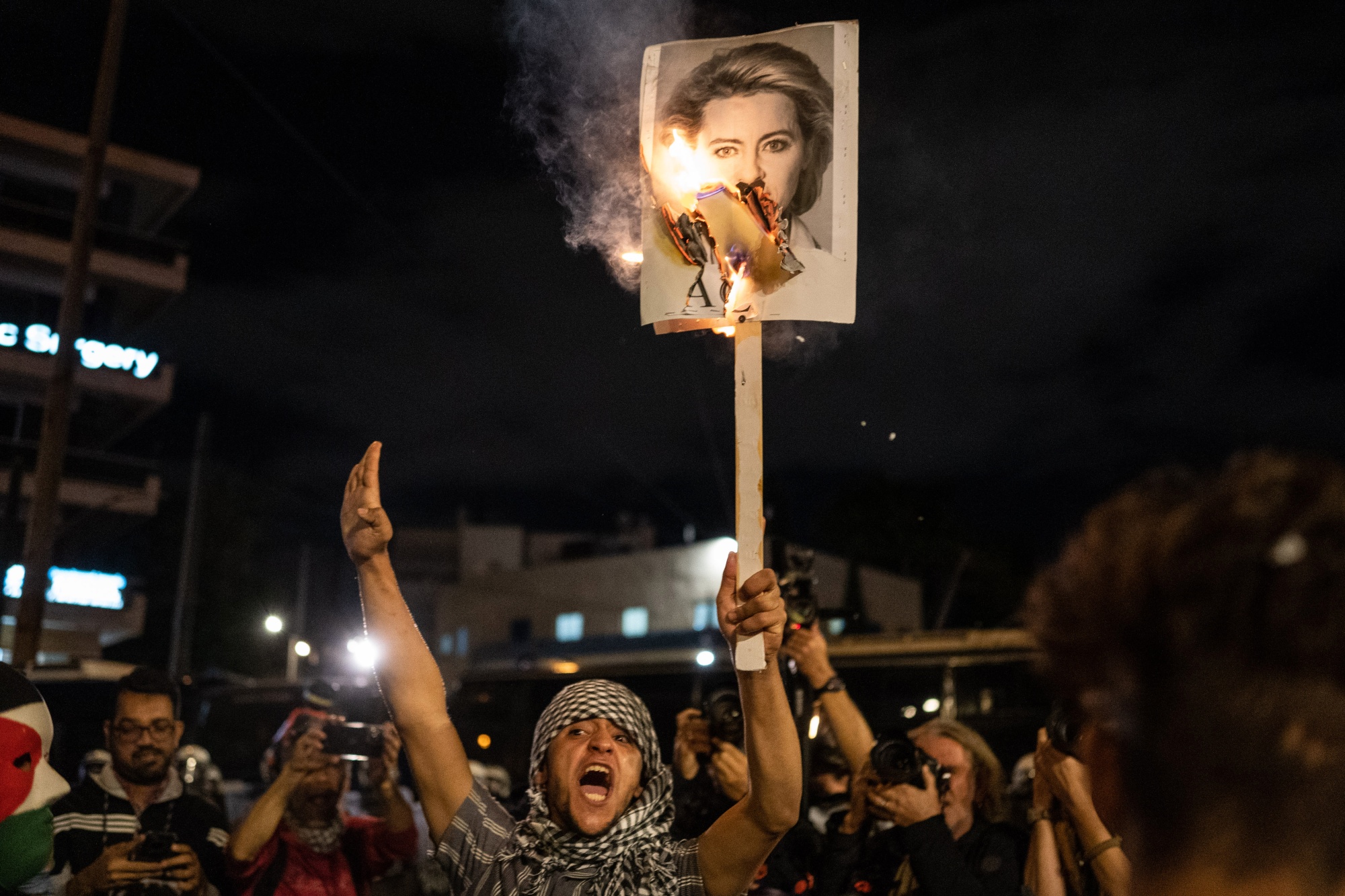 抗议者在雅典以色列大使馆外的亲巴勒斯坦示威活动中焚烧冯德莱恩的画像,时间为10月18日。摄影师:尼克·帕里奥洛斯/Bloomberg冯德莱恩面临的逆风对许多欧洲首都的人来说是显而易见的。一些人担心预算限制或政策反弹,而其他人则警告极右势力的蔓延。在德国,选民调查显示,反欧元的德国新选择党(AfD)在前共产主义东部地区和一些工业重镇地区领先。