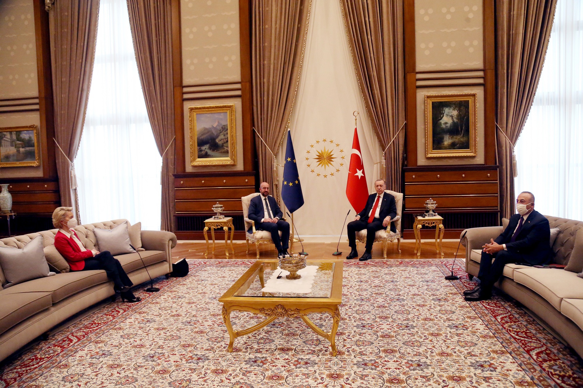 冯德莱恩(Von der Leyen)与米歇尔(Michel)和埃尔多安(Erdogan)在2021年4月6日的“沙发门”事件中在安卡拉合影。摄影师:Mustafa Kaya/Xinhua/Getty“在选举前利用时间来对抗自我造成的负面印象将至关重要,”CEPS智库的高级研究员史蒂文·布洛克曼(Steven Blockmans)表示。“这将是一项并不容易的任务。”