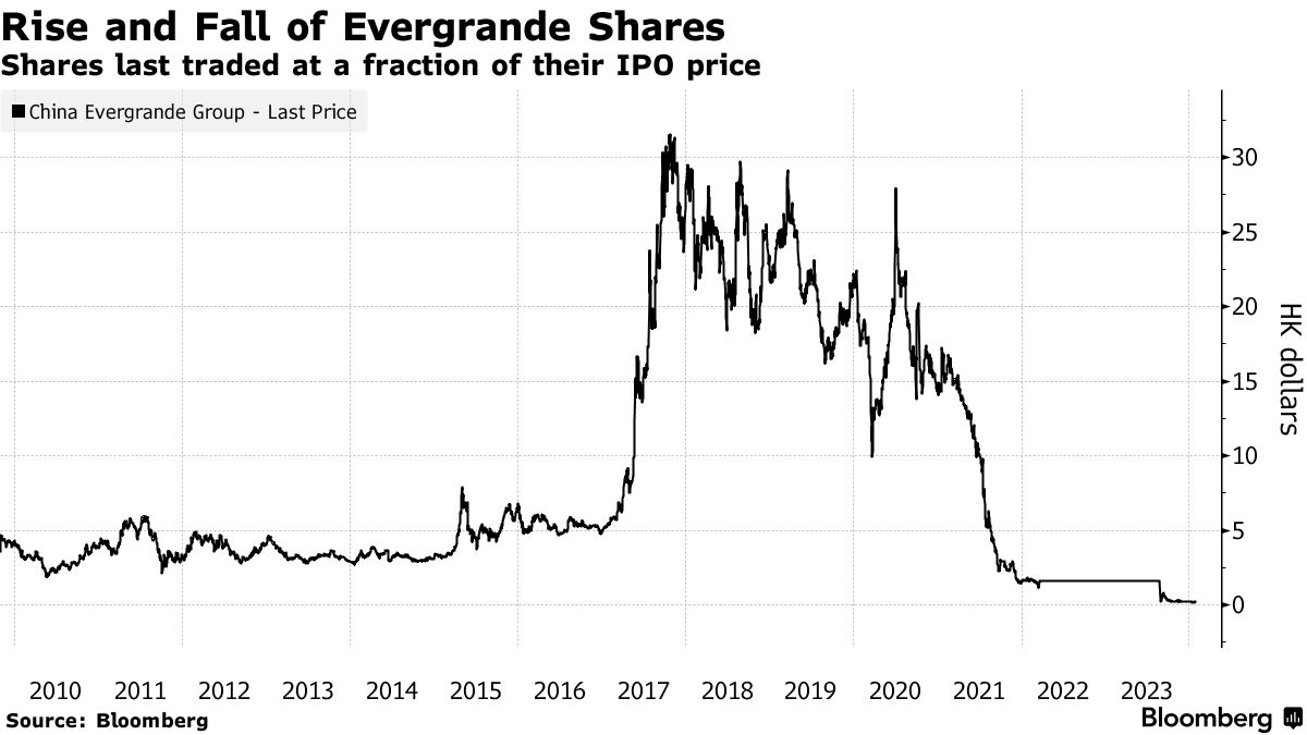 恒大股票和债券的价格表明持有者对其复苏没有信心。周一暂停交易前,其股价跌至16港仙,仅为2009年3.5港元的首次公开发行价的一小部分。根据彭博编制的数据,恒大大部分美元债券的价格被指示为每美元1.5分。