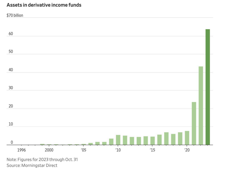 **Kris (09:31):**所以从波动率的角度来看,对吧?想象一点波动率的变动会让你赚或者亏多少,对吧?所以如果你净多头vega价值一百万美元,并且波动率上升一个波动率点,你就会赚一百万美元。反之亦然。所以这意味着,今天这个数字,净空头敞口,比2018年1月还要高两倍,那时正好是波动率大灾变之前。另外,我给你们发了这张来自晨星的图表,我认为这是非常关键的图表,这些衍生品收入产生基金,自2018年1月以来增长了超过10倍。这是另一个相当令人难以置信的事实。