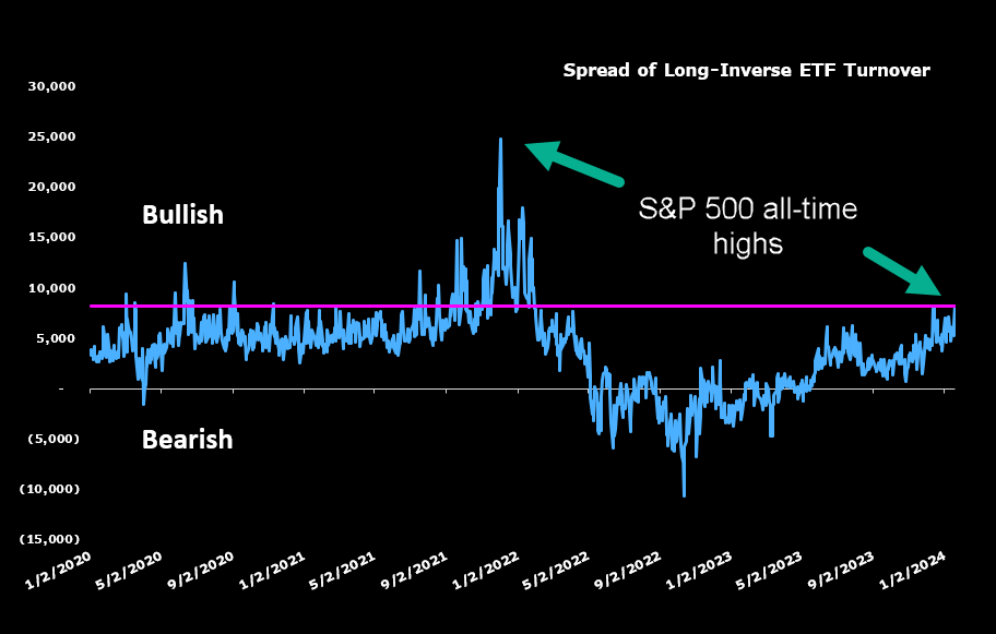 根据彭博智库的数据,做多与做空杠杆交易所交易基金的差价,历史上是股票市场顶部和底部的强有力指标,有利于多头,但远低于2021年12月标普500指数达到峰值之前的水平。