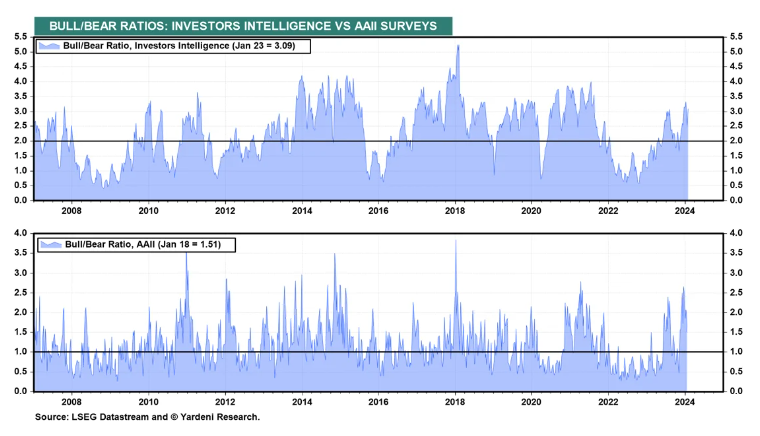 在1月23日的一周内,根据Yardeni研究的分析,通过对投资者情绪进行调查的投资者情报通讯作者的多头与空头比例达到了自2021年以来的最高水平,当时股票接近了2022年熊市前的峰值。美国个人投资者协会的一项每周调查也显示了情绪高涨的迹象。