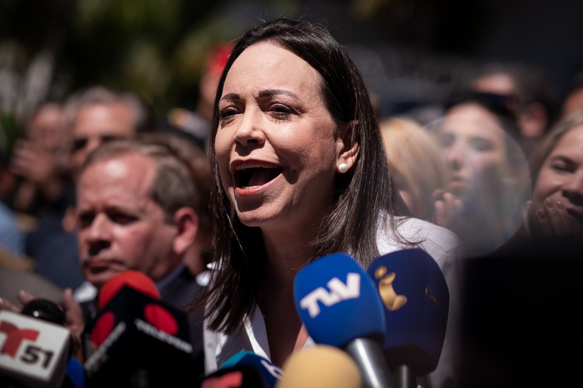 玛丽亚·科里娜·马查多周一在加拉加斯举行新闻发布会。摄影师:加比·奥拉/彭博社
