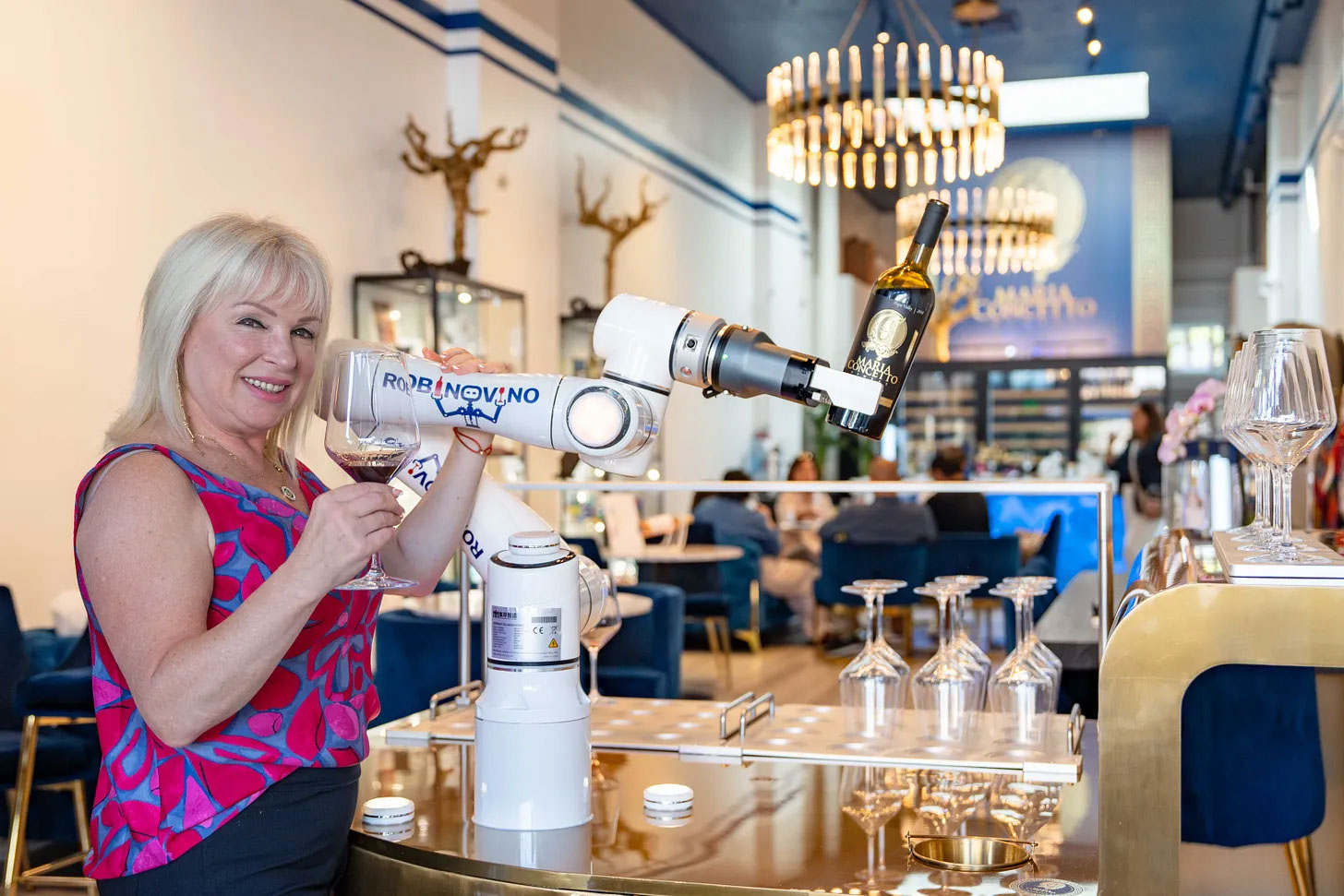 RobinoVino,纳帕的玛丽亚·孔切托酒庄品酒室里的机器人侍酒师。摄影师:蒂姆·卡尔·照片**人工智能将塑造您饮用的葡萄酒以及品尝方式。**今年的热词是人工智能,它正在彻底改变从葡萄园到酒杯的一切。多年来,葡萄酒庄一直在使用人工智能,特别是在葡萄园管理方面——传感器实时收集从光强度到土壤温度的各种信息。机器人正在修剪、喷洒,甚至将采摘的葡萄运送到酒庄。