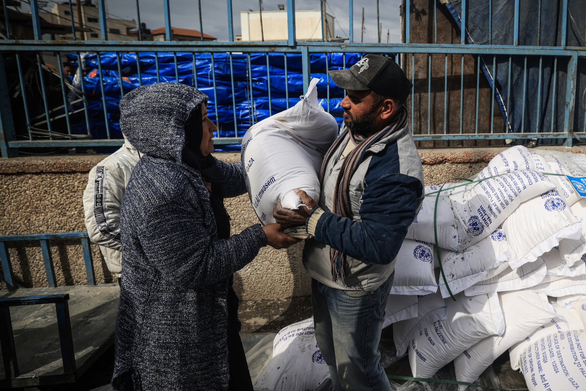 被迫离开家园的巴勒斯坦人在拉法联合国救济和工程机构中心接受食品援助,日期为1月28日。