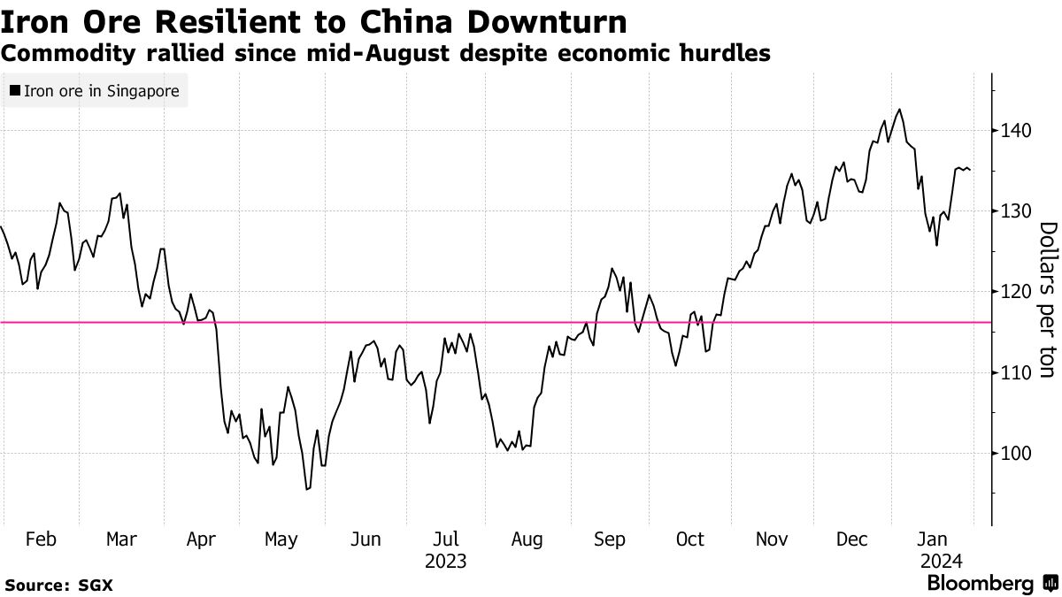 这一大宗收获可能给铁矿石市场带来一些阻力,尽管这个市场对中国这个最大的买家的放缓相对抗拒。自8月中旬以来,价格已经上涨了逾三分之一,这导致一些分析师预测2024年会出现下降。不过,最大的生产商力拓集团预计中国的增加刺激将推动逐渐复苏。