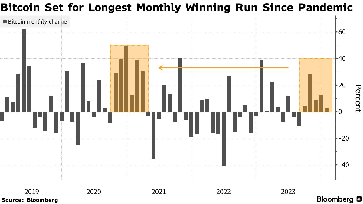 比特币正朝着连续第五个月上涨的方向发展,这将是自疫情期间由宽松货币政策推动的涨势以来,该代币的最长连续上涨纪录。