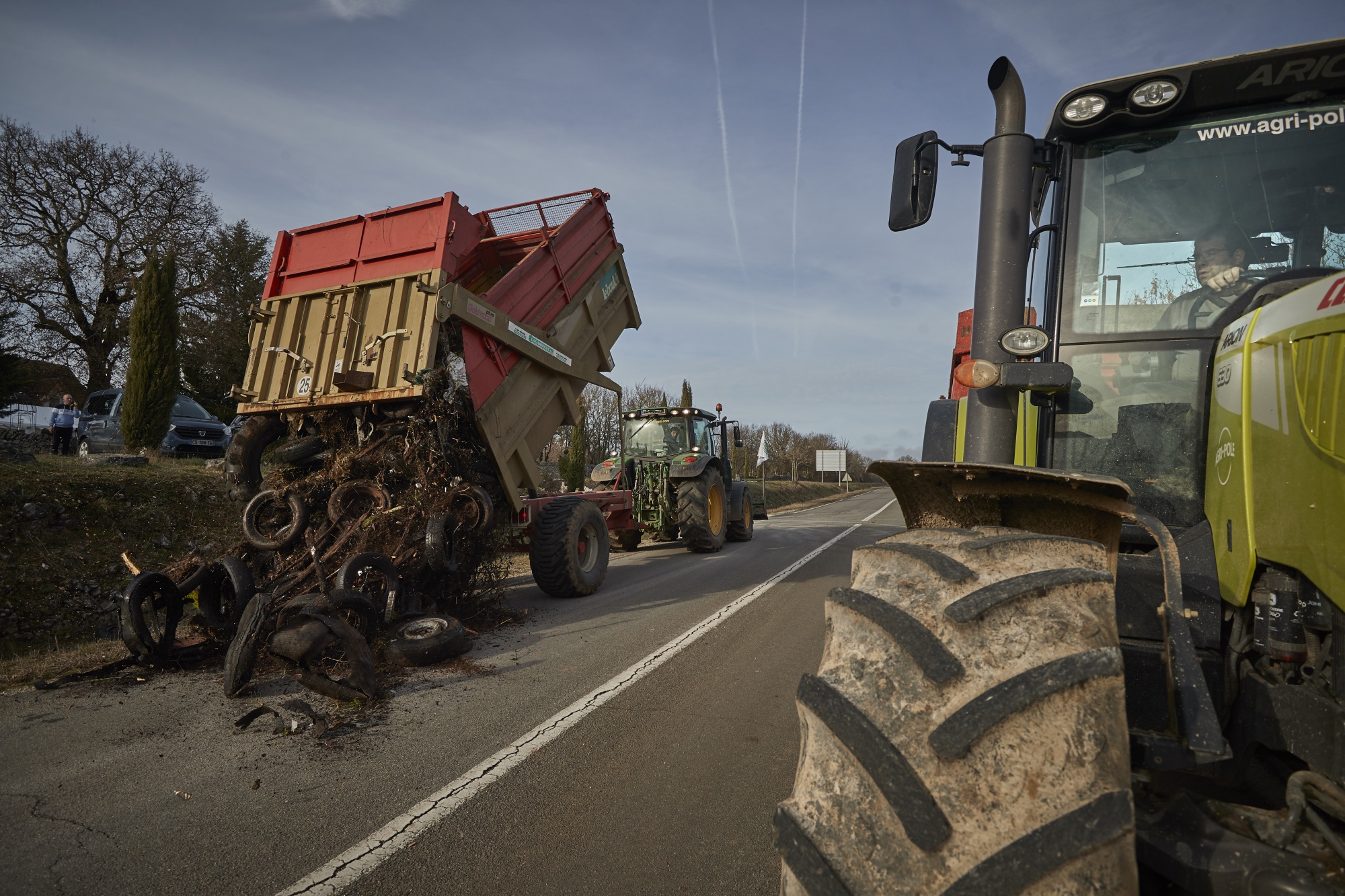 一位农民在图卢兹北部A20高速公路交叉口附近倾倒旧轮胎、粪肥和农场废物,以阻塞道路,这是1月26日全国农民封锁道路的一天。