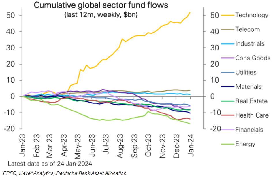 这是有道理的共识。巨头科技股推动了市场大部分的涨幅。德意志银行研究数据显示,科技股的仓位是唯一明显高于历史平均水平的,达到了73%的百分位数。