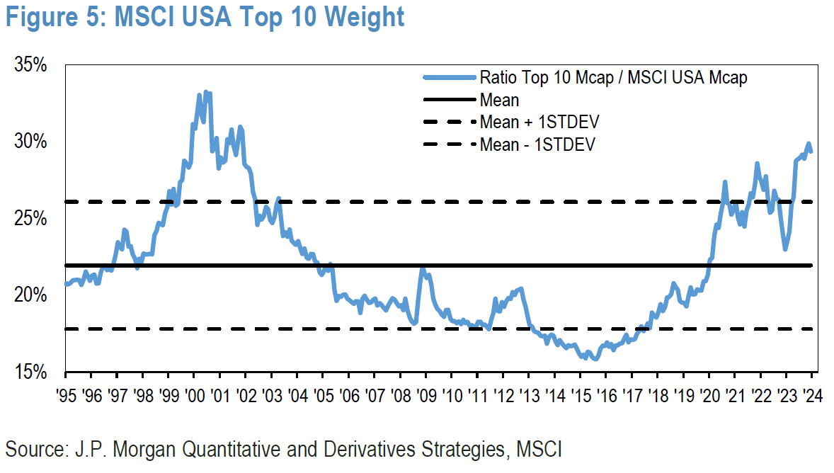 美国股票市场前十大股票的主导地位越来越像互联网泡沫,这增加了抛售风险,根据摩根大通公司的量化策略师。