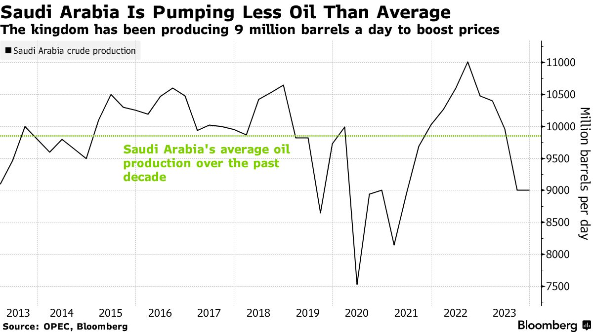 为了控制供应,因为对全球经济持续存在担忧,沙特阿拉伯去年延长了石油产量削减,使其日产量降至900万桶,为数年来的最低水平。