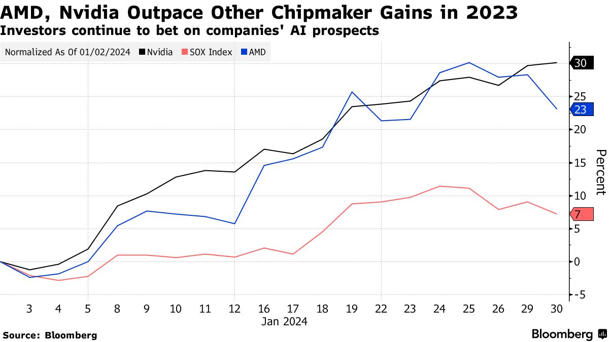 AMD股票一直是投资者寻求在人工智能计算上押注的最爱之一。今年其股价在费城证券交易所半导体指数中表现第二好,涨幅为17%,与2023年的表现相似。