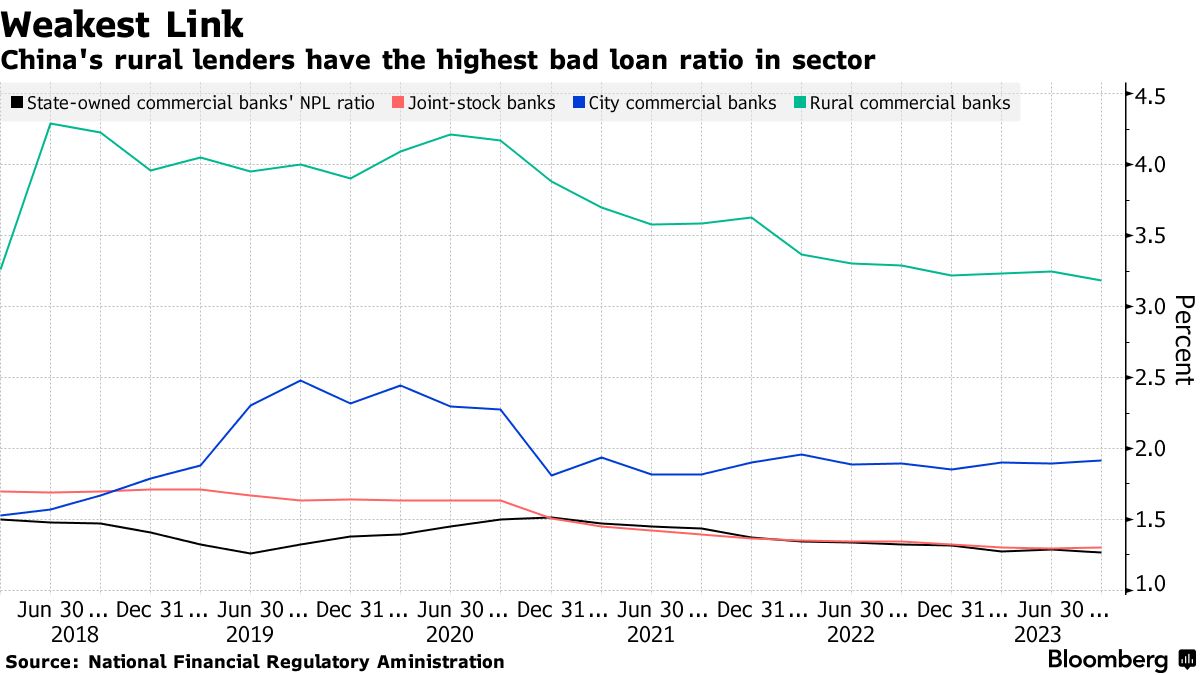 中国银行业多年来一直饱受一系列问题困扰,包括房地产市场深度低迷和整体脆弱的经济。农村合作社体系中的2100家银行在2022年年底的不良贷款比率达到3.48%,是整个行业的两倍多。