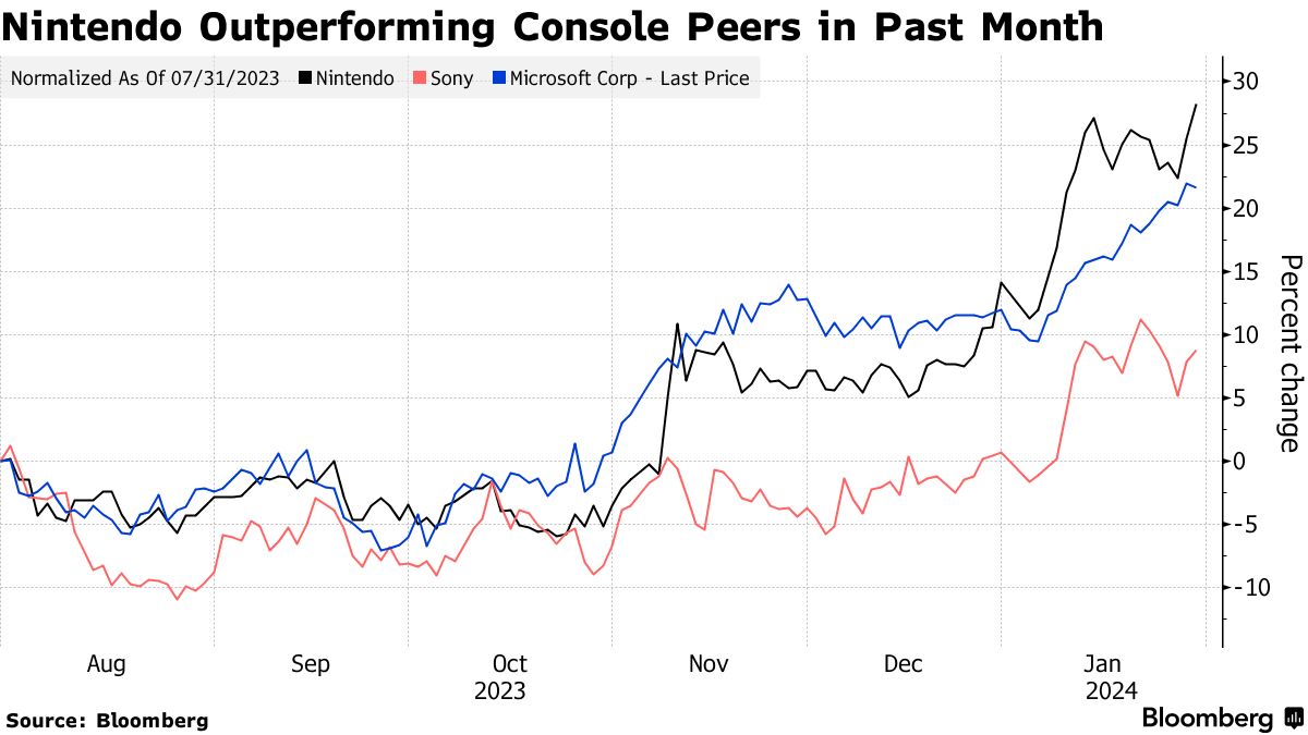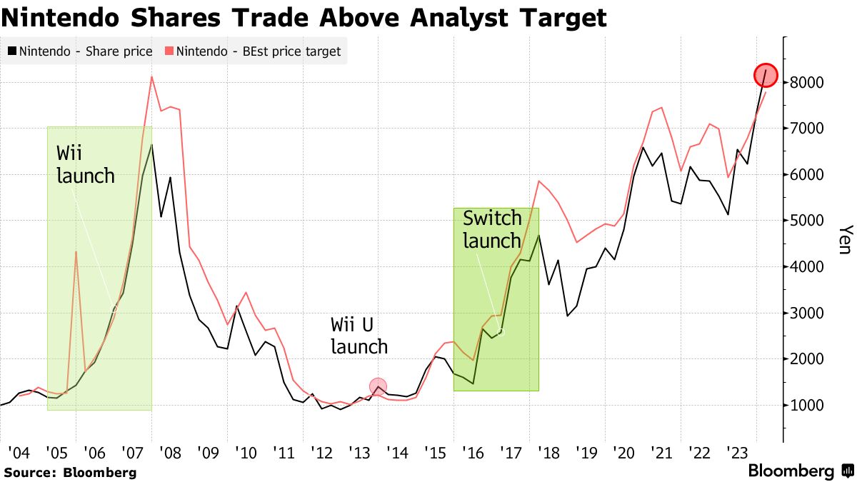 这家马里奥和塞尔达创造者的股价在过去一年飙升了47%,而Topix指数仅上涨了28%。一些人已经给新机器起了“Switch 2”的外号,对新机器的期待推动了股价上涨,尽管公司尚未正式宣布。对于更多以任天堂角色为主题的热门电影的期望以及日本股市持续繁荣也起到了推动作用。