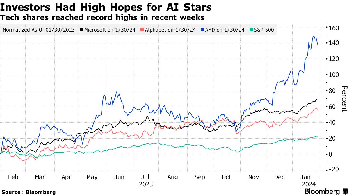 科技巨头的股价在周二晚间交易中下跌,因为它们公布了2023年最后三个月的业绩和本季度的预测。这三家公司都特别强调了在人工智能方面的进展。在AMD的情况下,该公司预测其新的人工智能处理器将带来比预期更多的销售额。微软吹嘘用户正在接受其人工智能助手,而谷歌表示该技术正在改进其搜索和云计算服务。
