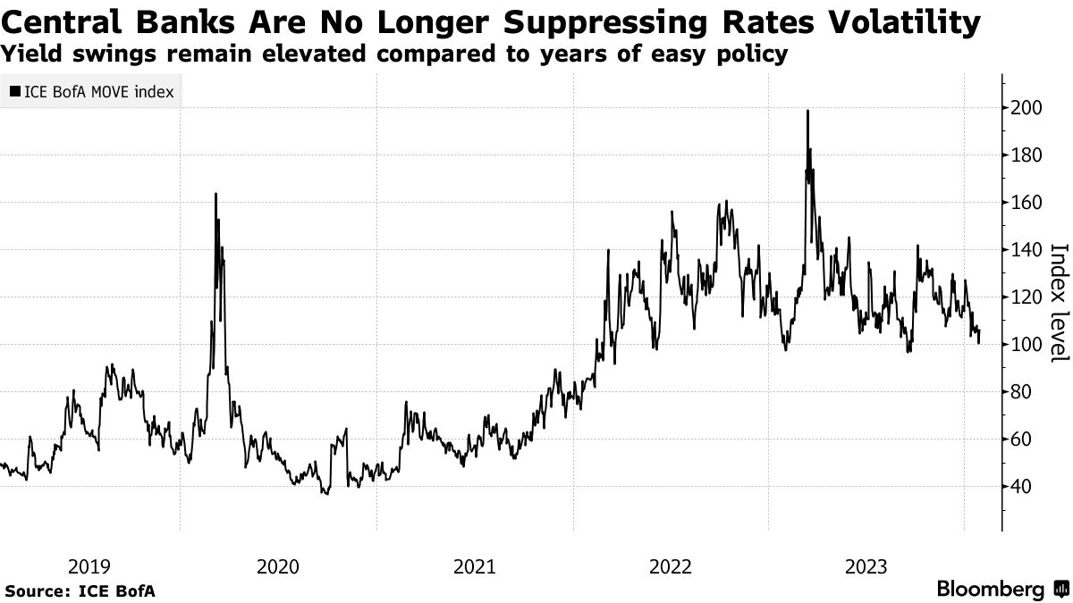 这意味着将通胀降至美联储和欧洲央行的2%目标。尽管在大西洋两岸都降至约3%,彭博固定收益预计美国通胀将在2024年中期之前保持高于目标水平。持续高于目标水平将限制大幅放松的能力,这一点“市场有点忽略了,” 彼得斯说。
