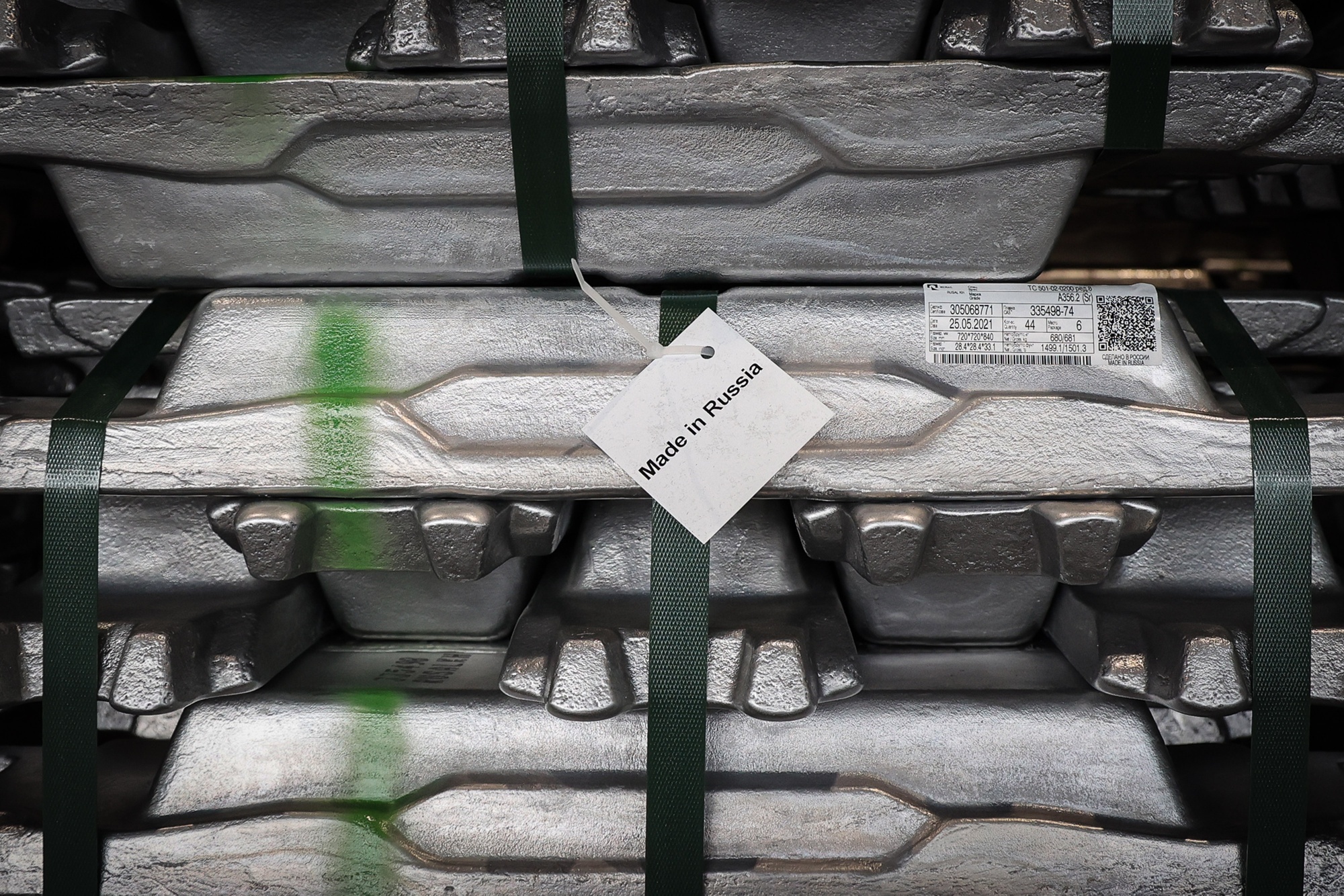 一堆铝锭上贴着“俄罗斯制造”的标签。