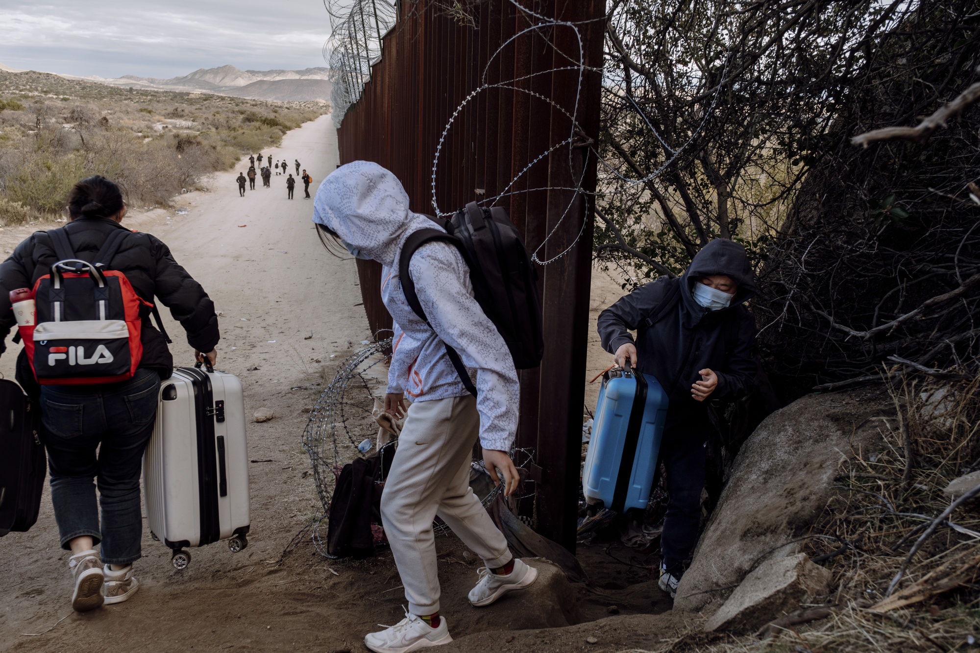 移民穿过美墨边境围栏在加利福尼亚州Jacumba Hot Springs。