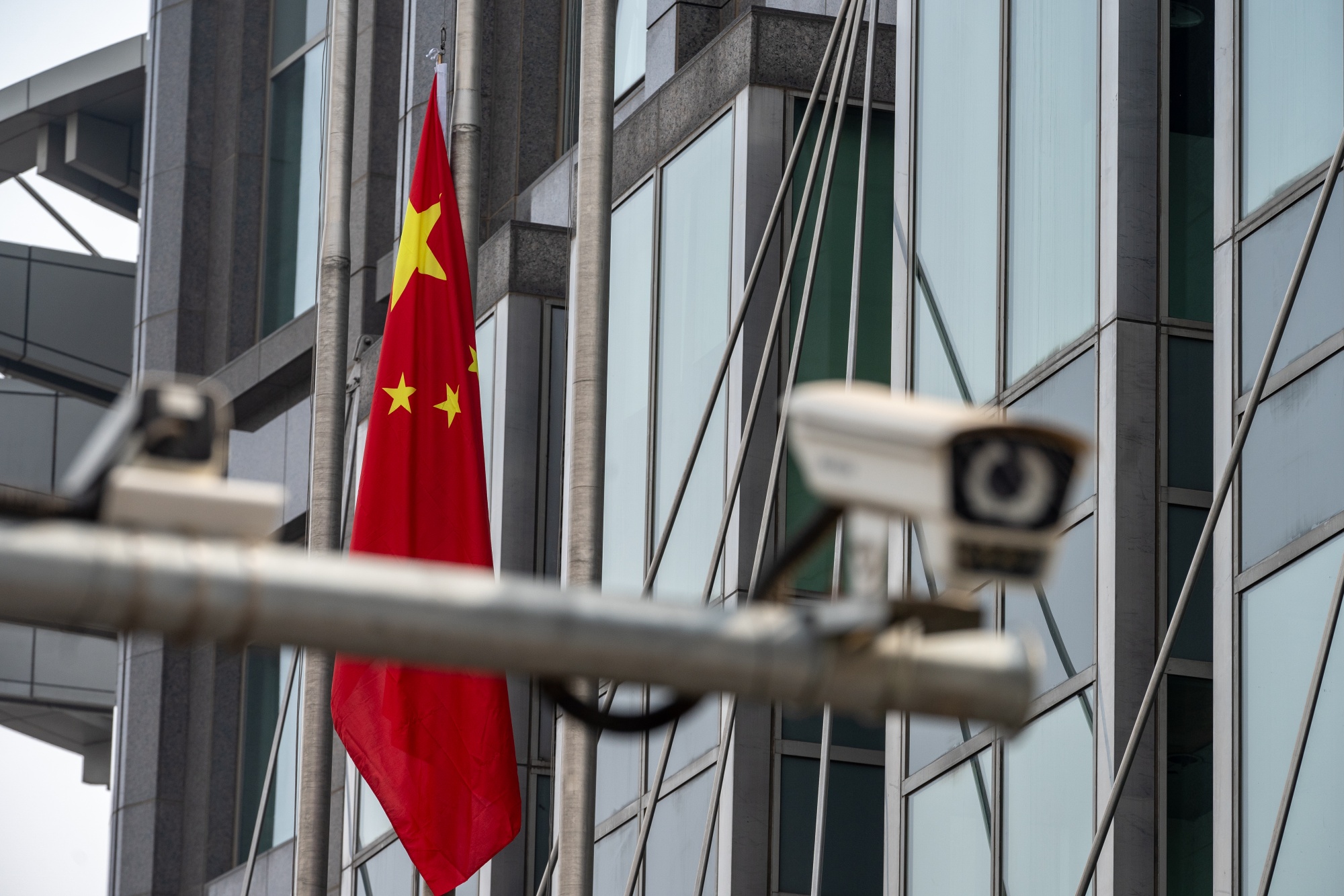 一个监控摄像头后面展示了中国国旗。