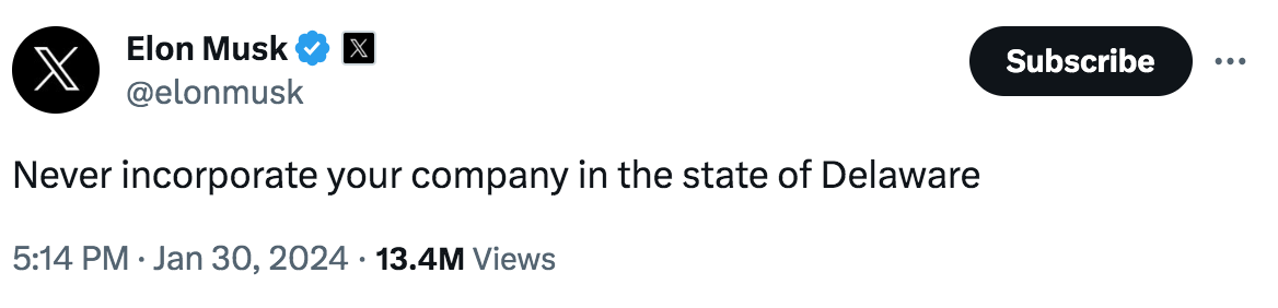 这并不是一个特拉华州的事情,尽管德州或其他地方的商业法庭可能更愿意对CEO们或者马斯克表示同情(彭博社报道称,“马斯克还在周二要求特斯拉的支持者投票,决定是否将特斯拉的注册文件转移到德克萨斯州”,当然)。这是一件公开公司的事情:如果你经营一家公开公司,你不仅对股东有公司法上的受托责任,而且还有真正的外部股东,指数基金、激进分子、爱好者和任何想要购买股票的人。如果你经营一家私人公司,即使是在特拉华州注册的(比如,SpaceX),你可以对谁是你的股东有很大的控制权,并且你可以按照他们的意愿来经营公司,通常也是你自己的意愿。如果你经营一家公开公司,你无法控制谁能成为股东,或者他们可以抱怨什么,或者法院会如何看待他们的抱怨。