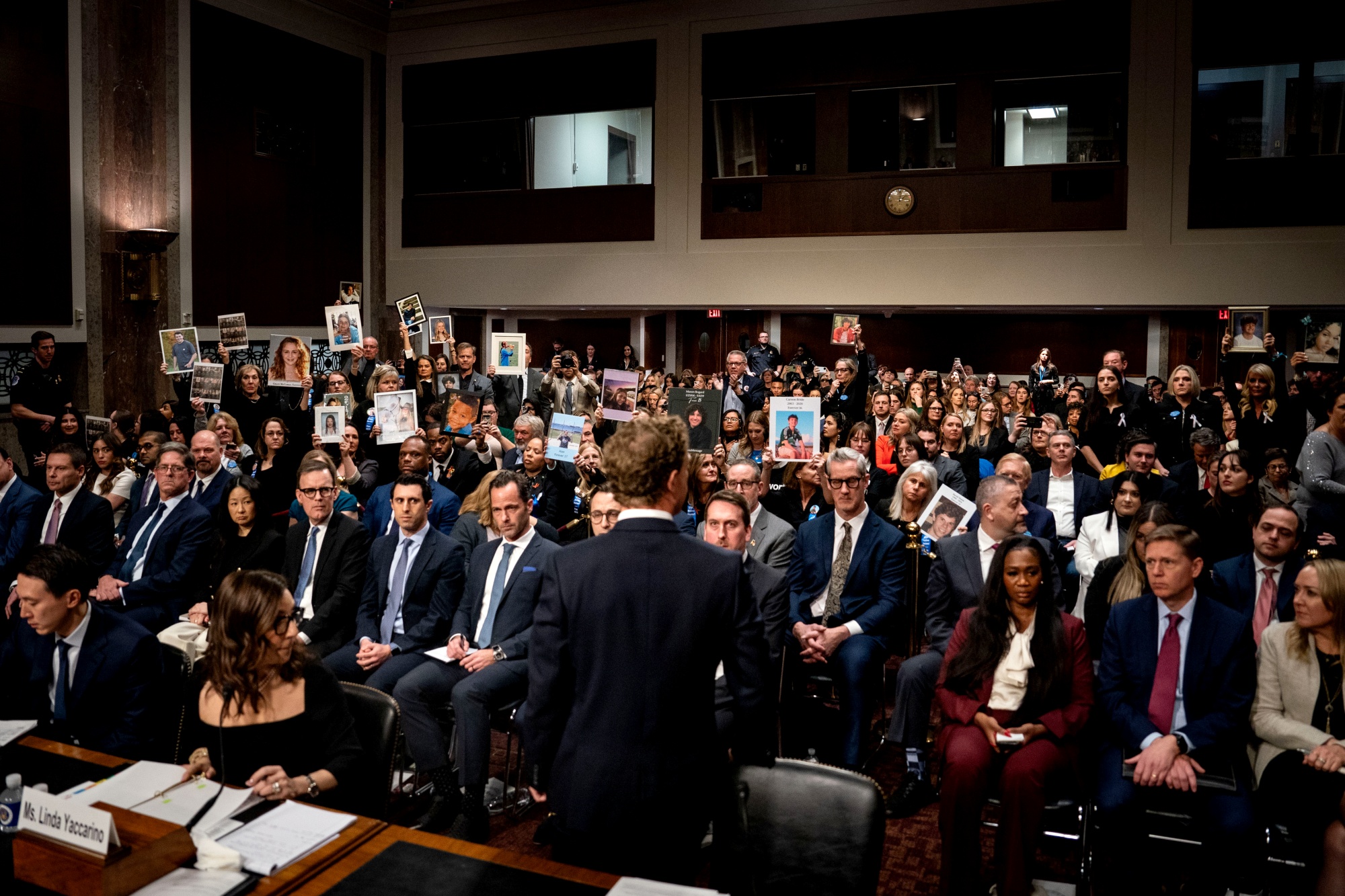 参议员林赛·格雷厄姆告诉Meta的CEO他“满手鲜血”。参议员泰德·克鲁兹讨论了一张Instagram关于性虐待的警告屏幕的截图,该截图给用户提供了“获取资源”或“无论如何查看结果”的选择。甚至参议员乔什·霍利要求扎克伯格直接向那些受到他平台算法伤害的家庭道歉。扎克伯格屈服,转身向人群道歉,人群举起受害者的照片: