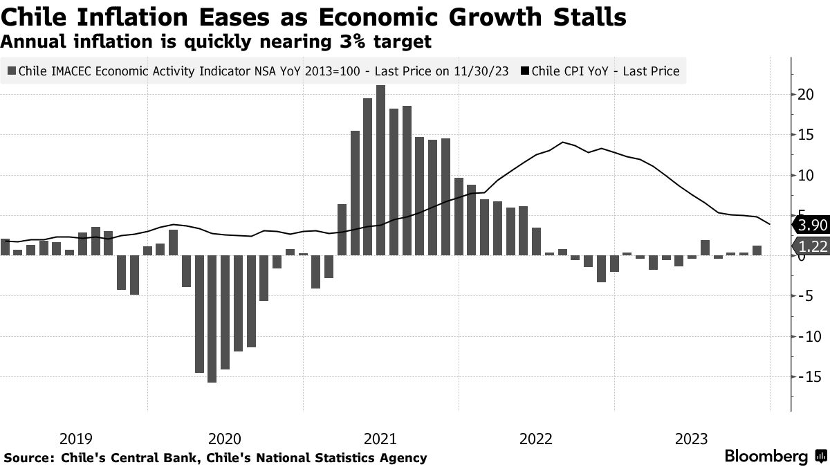 自7月以来,随着3%的通胀目标逐渐实现和国内活动的缓慢复苏,决策者已经将借贷成本下调了四个百分点。尽管其他拉美国家也在放松货币政策,但智利由于去年经济表现远不如人,因此有更多的空间这样做。12月份通胀率和核心指标(不包括波动较大的项目)的双双下降,也加大了进一步降息的可能性。