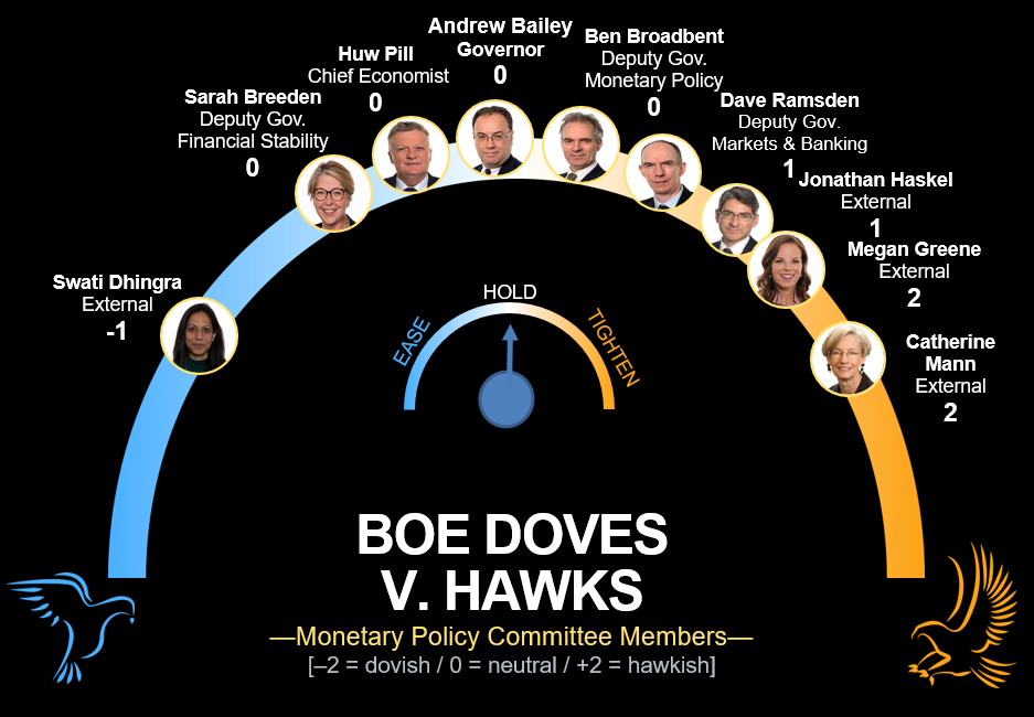 英国九位成员组成的货币政策委员会在12月份以6-3的投票结果决定维持利率不变,其中凯瑟琳·曼、梅根·格林和乔纳森·哈斯克尔倾向于加息。经济学家预计,至少有一名鹰派成员将在周四加入多数派,投票支持不变。