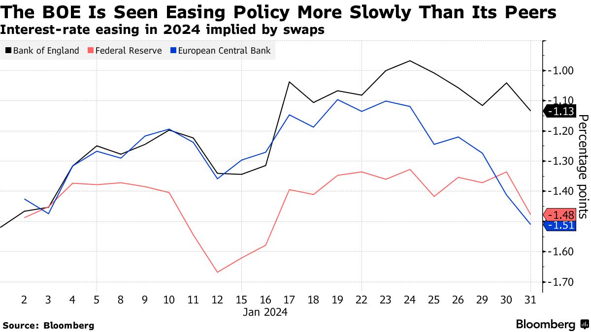由英格兰银行行长安德鲁·贝利领导的决策者们暗示,他们将在美联储和欧洲央行放松借贷成本之后采取行动,此前通胀出现了四十年来最严重的波动。但是急剧缓解的价格压力以及英国去年陷入衰退的风险,已经促使市场定价预计从2024年年中开始降息。