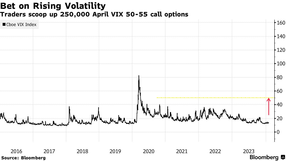 周三交易开始后一个小时,一名交易员似乎购买了5万份看涨期权,押注VIX指数可能在4月份飙升至50,这个水平是在疫情期间最后一次见到的。成本相对较低——每份20美分——并且进行了对冲,这使得买方可以从市场中较小的波动中获利。