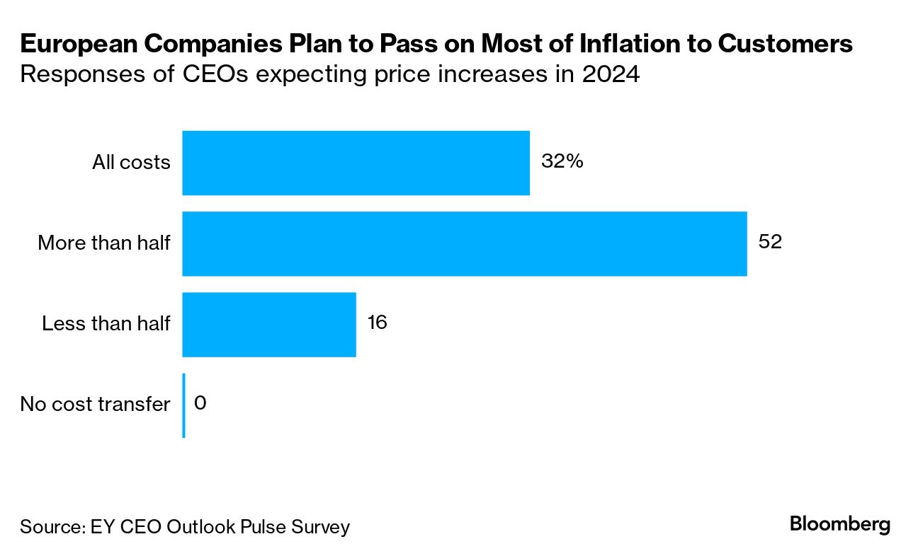 欧洲公司老板计划将部分上涨成本的负担转嫁给客户,这是根据安永(EY)发布的一项CEO调查得出的结论。超过一半的受访者预计今年的经营成本将增加,超过五分之四的受访者希望将至少一半的额外费用转嫁给消费者。货币官员刚刚开始重新控制该地区历史性通货膨胀的激增,他们表示,这在一定程度上是由公司过度提价所导致的。