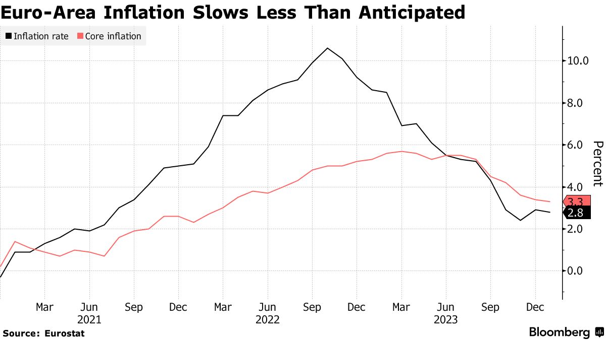 欧元区通胀在年初放缓的幅度低于预期,考验了投资者对欧洲央行将在春季开始降息的预期。去年12月因基数效应而出现反弹后,1月份消费者价格比去年同期上涨了2.8%,欧洲统计局周四表示。这高于经济学家在彭博调查中的中值估计2.7%。核心通胀,即不包括食品和能源等波动较大的组成部分,也没有像预期的那样减少,而是降至了3.3%。