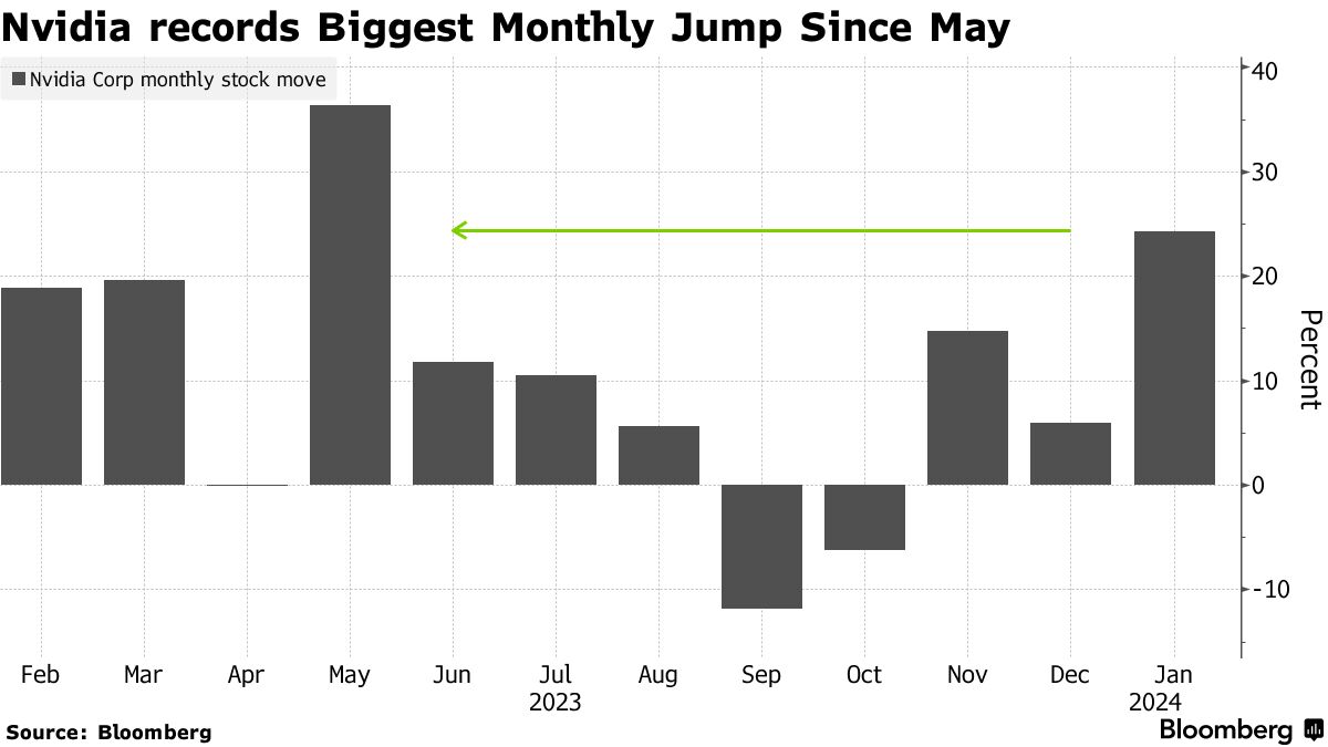Nvidia Corp. 在1月份上涨了24%,这是自5月份以来的最大涨幅,清楚地表明这家芯片巨头继续受益于过去一年华尔街上人工智能狂热的影响。这一涨势远远超过了科技股重的纳斯达克100指数在同一时期的1.9%涨幅。