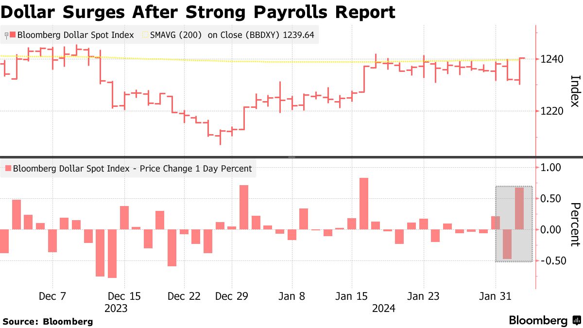 美元在就业报告大幅增长后跳升,使得美元汇率回到了美联储去年12月转向之前的水平,同时也让押注即将出现降息的交易员措手不及。