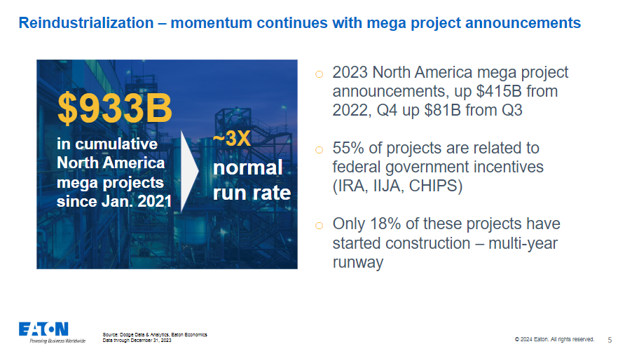 来源:伊顿公司第四季度收益报告根据伊顿公司的统计,自2021年初以来,北美地区已经累计宣布了价值9,330亿美元的大型项目,但只有18%已经动工,约有10%被取消或者延迟。一般来说,从项目宣布到相关的电气设备订单开始出现在伊顿的收入中,需要三到五年的时间。“主要结论是,我们还没有看到大型项目数量或规模的大幅增加对我们产生显著影响,但这种影响正在到来,”首席执行官克雷格·阿诺德在本周的公司收益电话会议上表示。“我们之所以如此强调大型项目,是因为它是我们未来数年发展的重要指标,也为投资者提供了对未来数年前景的可见性。”
