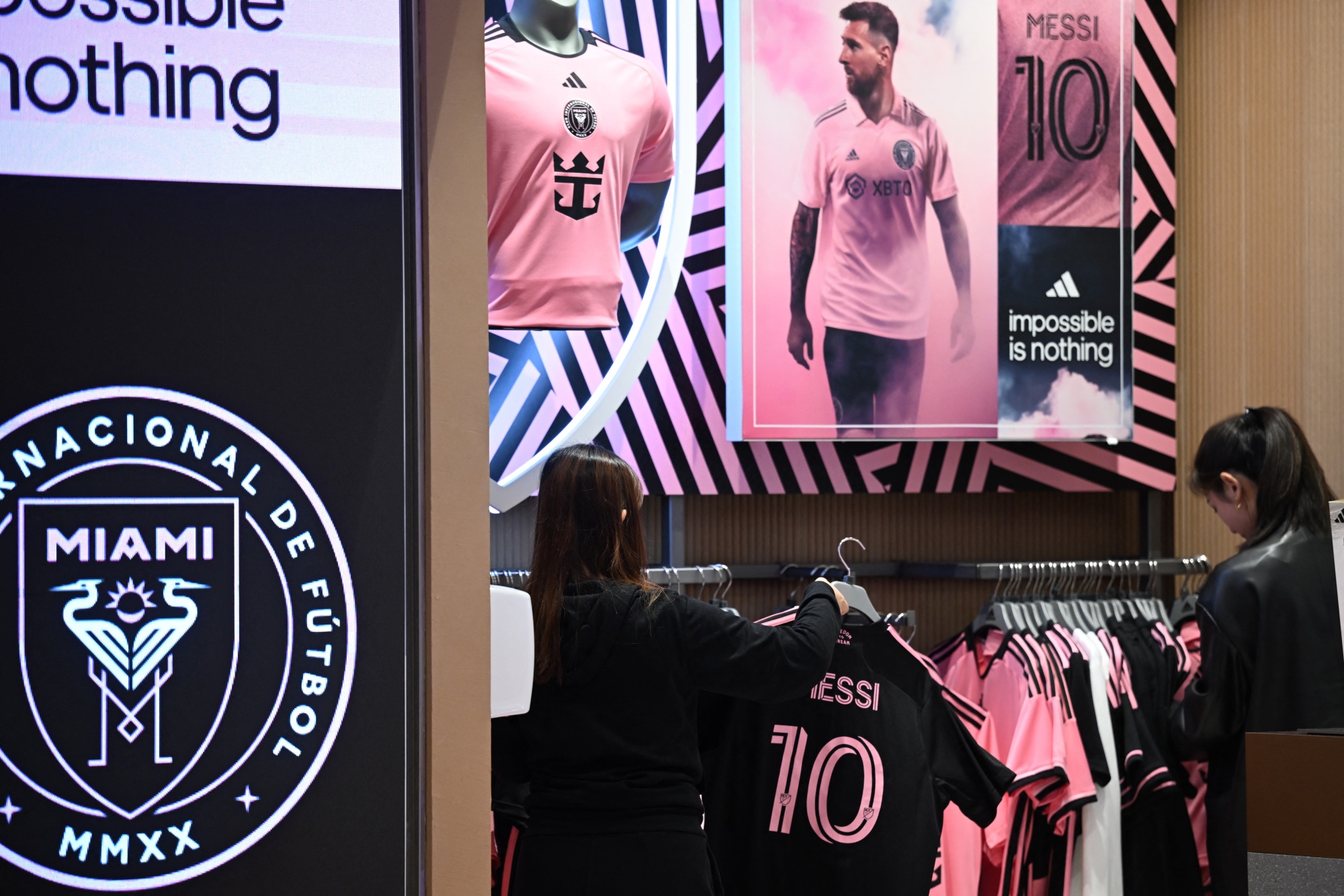 香港出售的梅西球衣。摄影师:Peter Parks/AFP/Getty Images国际迈阿密足球俱乐部由