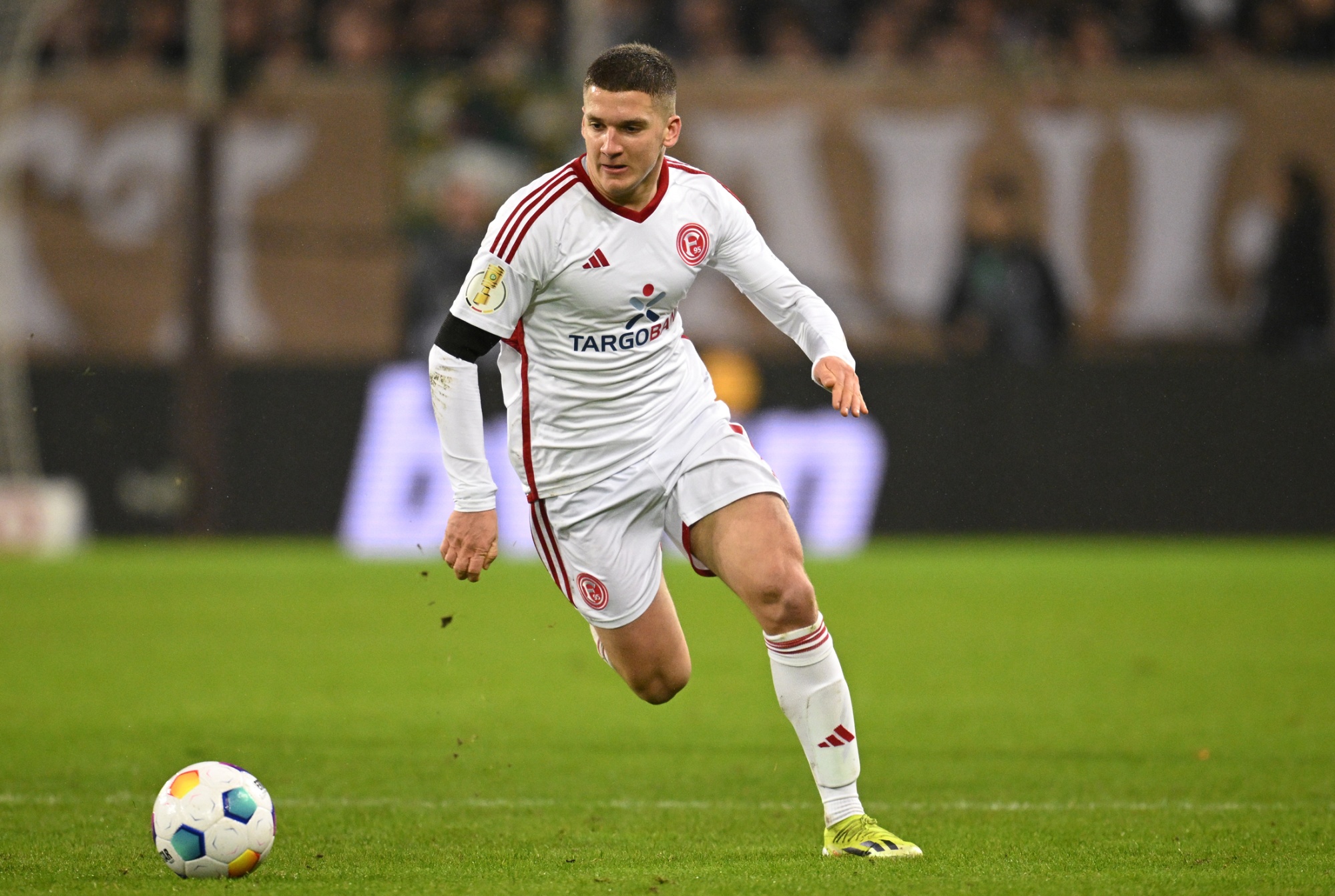 Fortuna杜塞尔多夫的Christos Tzolis。摄影师:Stuart Franklin/Getty Images在杜塞尔多夫Fortuna对阵圣保利队的德乙联赛比赛中,现场观众接近满员,约有5万人。这支球队被称为朋克摇滚队。但大多数球迷甚至没有花一欧元入场。