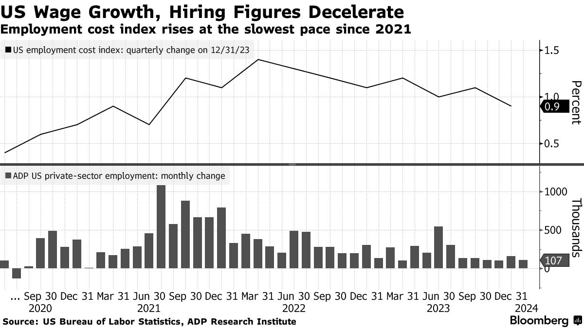 一项广义的劳动力成本指标比预期下降,这是通胀压力减轻的新迹象,这给了美联储官员今年降息的空间。就业成本指数,即工资和福利的衡量标准,在第四季度增长了0.9%,是自2021年以来的最小增幅。
