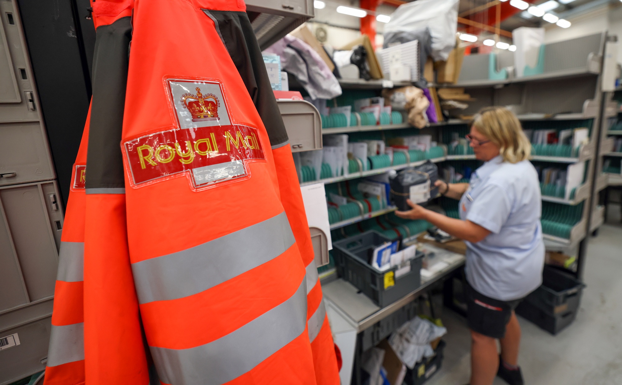 一名员工在英国切尔姆斯福德的分拣中心整理邮件。