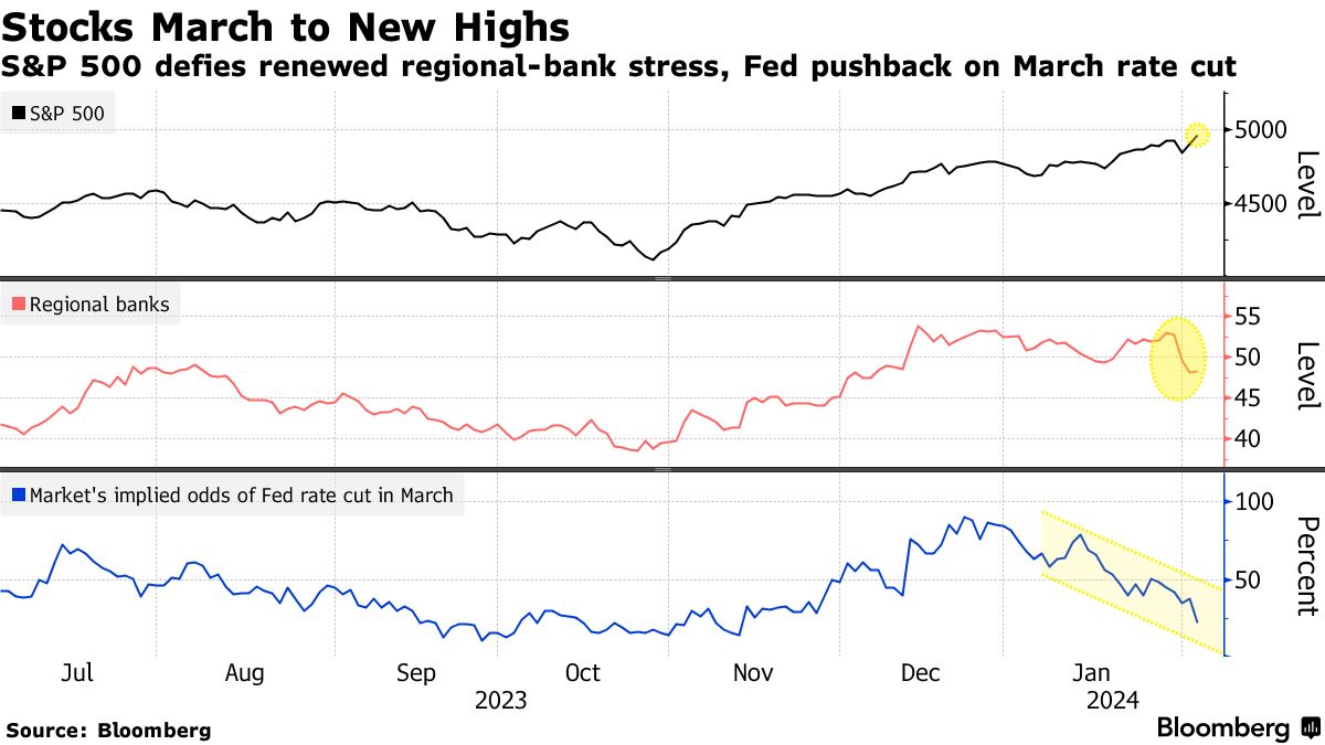 从美联储主席鲍威尔拒绝在三月降息到纽约社区银行股份有限公司的崩溃,市场面临自十月以来可能是最艰难的一周新闻。然而,在经济仍然强劲的迹象支撑下,标普500指数设法创下历史新高。