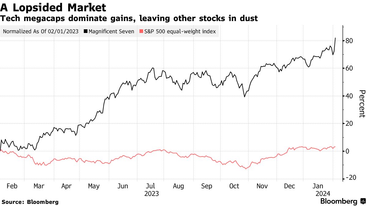 可预见的是,包括JPMorgan Chase & Co.和美国银行公司在内的公司的策略师们发出了警报。他们将当今大科技公司的集中度与20年前的互联网泡沫相提并论,并表示它们的涨幅速度可能是不可持续的。这一类股票在过去一年里飙升了80%,而标普500指数中的平均股票仅上涨了3%。