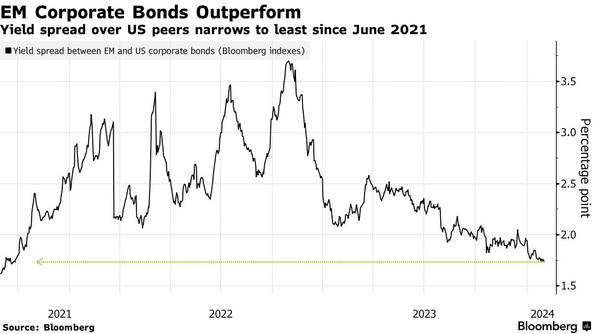新兴市场公司债券收益率与彭博美国公司总回报指数之间的收益率差跌至174个基点,创下2021年中期以来的最低水平。投资者表示,这一差距仍然吸引收益猎人,相对于国债提供了270个基点的收益率溢价。