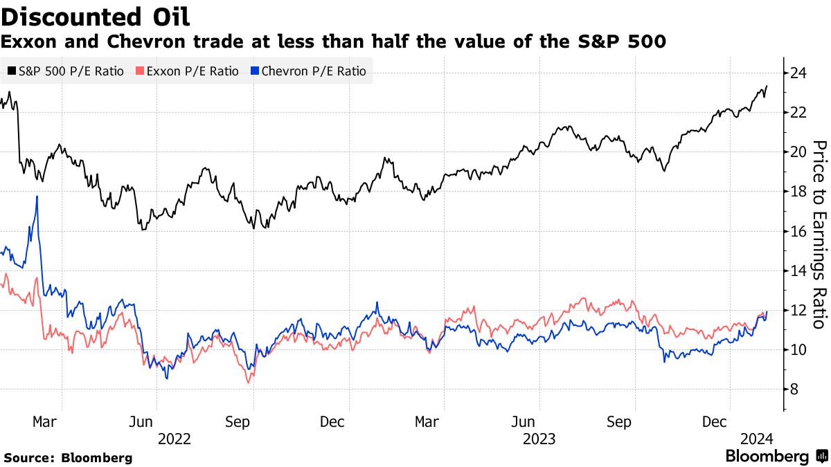 摄影师:James MacDonald/Bloomberg埃克森美孚公司和雪佛龙公司去年向股东派发了587亿美元,并计划在2024年继续派发更多,即使原油价格下跌也是如此。然而,它们在受硅谷影响的股市中竞争艰难。