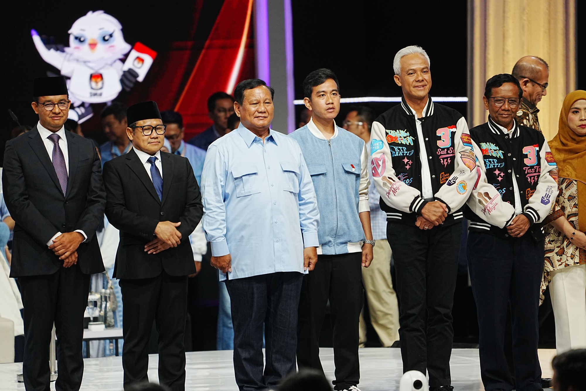 安尼斯·巴斯韦丹、穆哈伊明·伊斯坎达尔、普拉博沃·苏比安托、吉布兰·拉卡布明·拉卡、甘加尔·普拉诺沃和马夫德·马哈茂德在周日雅加达的最后一场总统候选人辩论会上登台。摄影师:迪马斯·阿迪安/彭博社