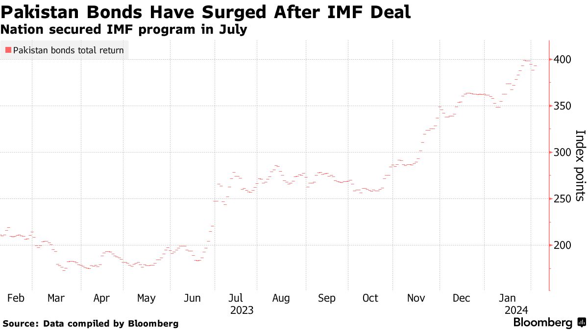 2023年巴基斯坦债券为投资者带来近100%的回报,上个月上涨了9%,使其成为全球表现最佳的债券之一。这种出色的表现可能会暂时停顿,因为这个南亚国家将在周四举行选举,选出新政府,新政府可能会谈判寻求新的国际货币基金组织紧急援助,因为目前的援助将在三月份到期。