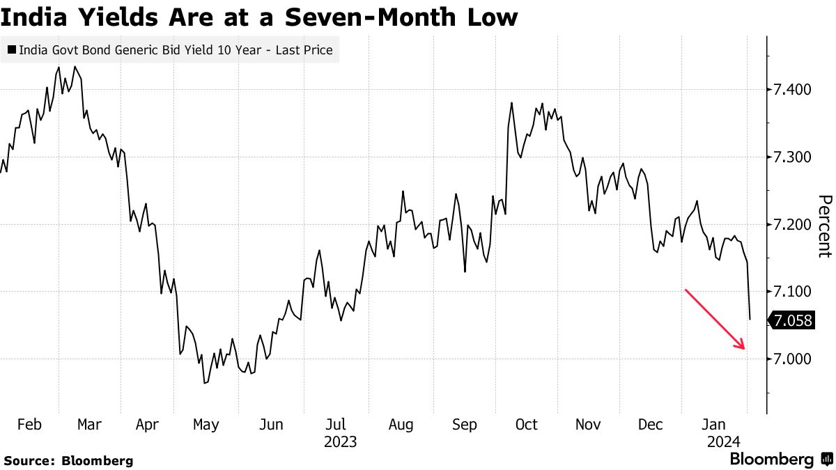 在全球指数从6月开始纳入之前,印度债券在过去三个月里一直受到海外资金流入的推动。自10月底以来,10年期收益率已下降约30个基点。在财政审慎预算后,上周下降了12个基点,为自2022年11月以来最大跌幅。