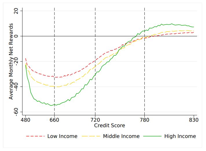 根据信用评分不同的信用卡用户计算奖励价值,扣除利息成本和刷卡费用。取自上述文中的论文(超链接在文本中):“谁为你的奖励买单?信用卡市场中的再分配”但可能最有趣的是,当考虑奖励成本和坏账与刷卡费用和利息收入相抵时,根据同一研究,银行在信用评分范围内的奖励卡上赚的钱比从普通的经典信用卡上赚的钱更多。最终,这有点像赌博:庄家总是赢。