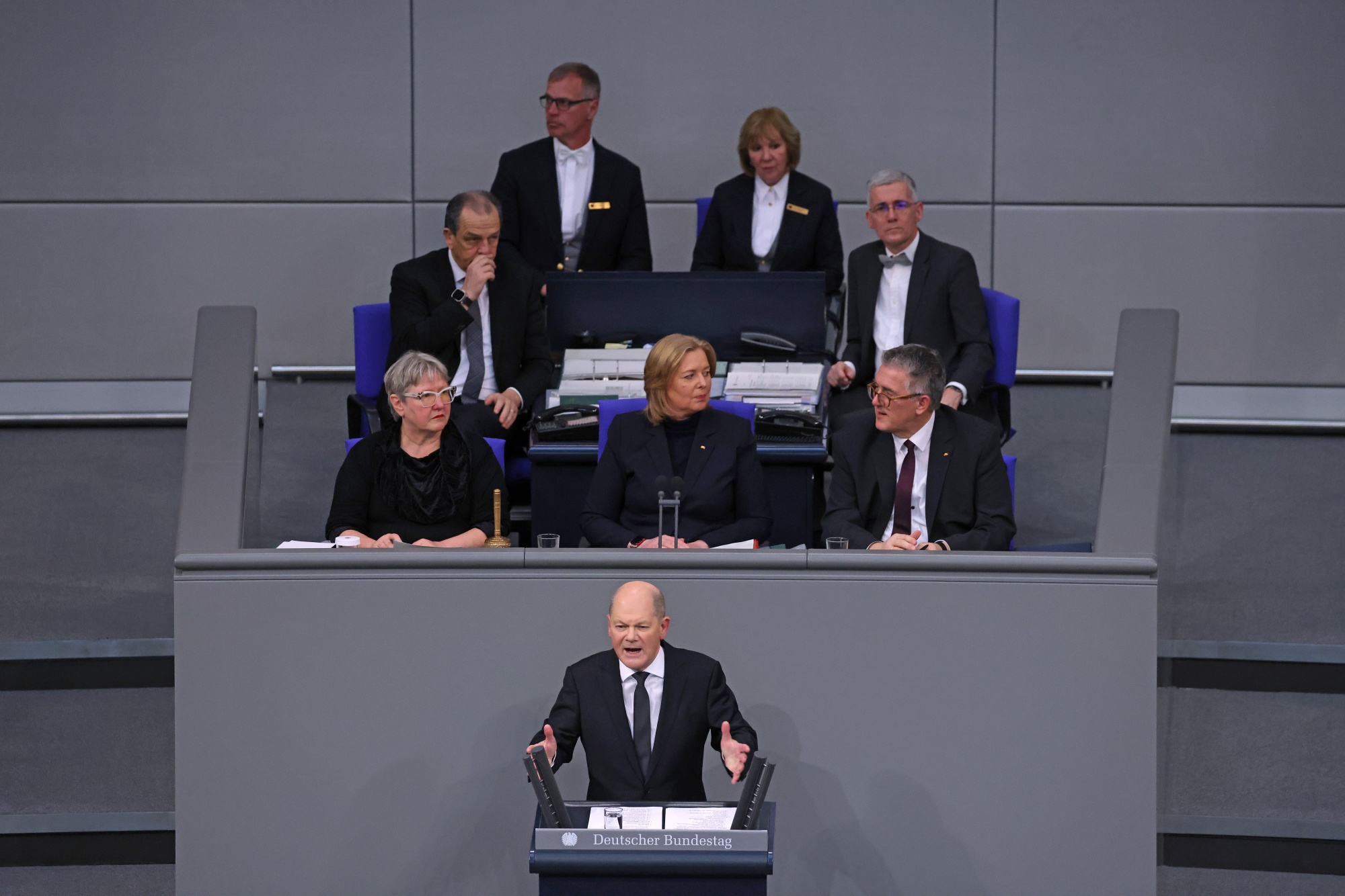 Olaf Scholz 在 1 月 31 日的联邦预算辩论中发言。摄影师:Sean Gallup/Getty Images社民党议员为总理的好战讲话欢呼。至少目前,他已避免了公开叛乱。