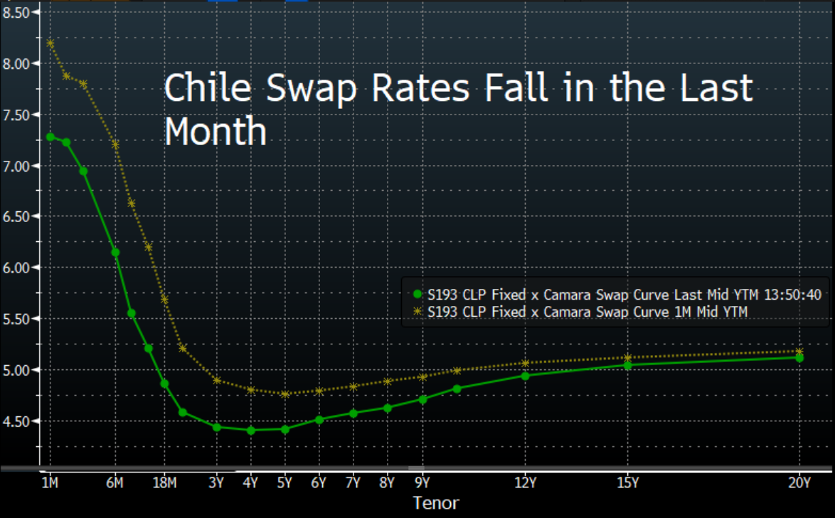 智利掉期市场的流动性较高,更容易追踪市场预期的变化。过去一个月,一年和两年期掉期利率分别下降了99和62个基点。