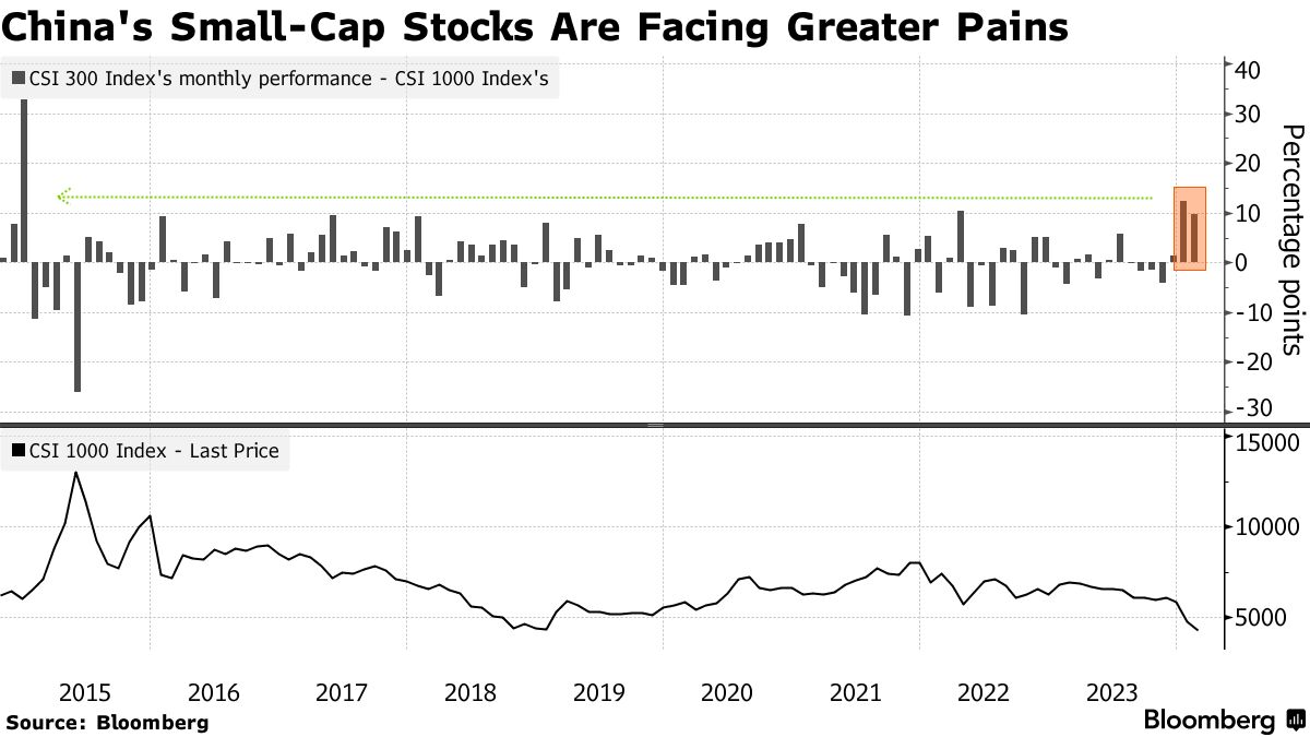 “目前市场依赖于国家队的支持,投资者将大盘股视为购买目标,”Aletheia Capital Ltd.的中国策略师Vincent Chan说。“这使得小盘股投资者不愿持有头寸,因为他们没有下行保护。”