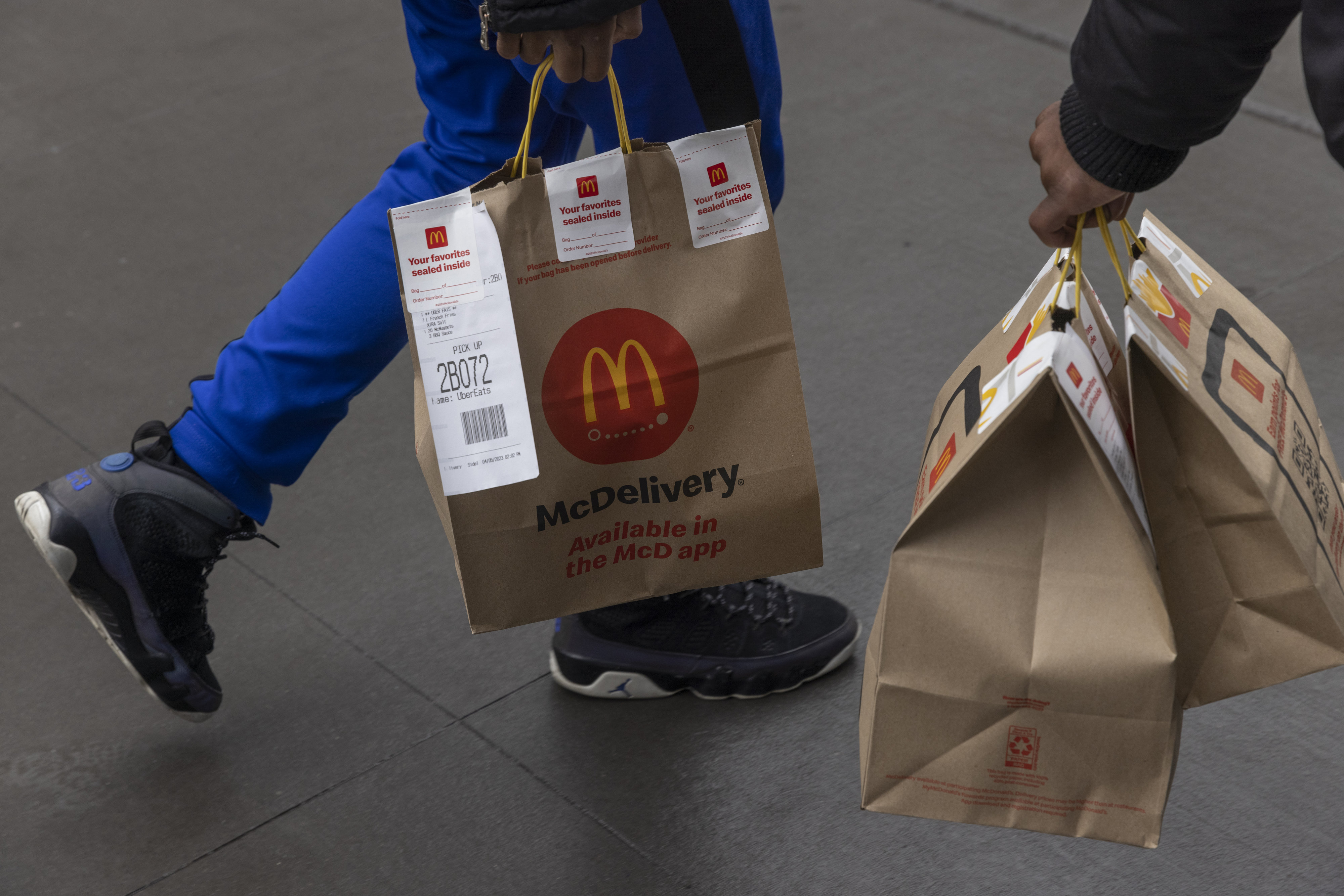 顾客手提麦当劳袋子在纽约。摄影师:维克多·J·布鲁/彭博社